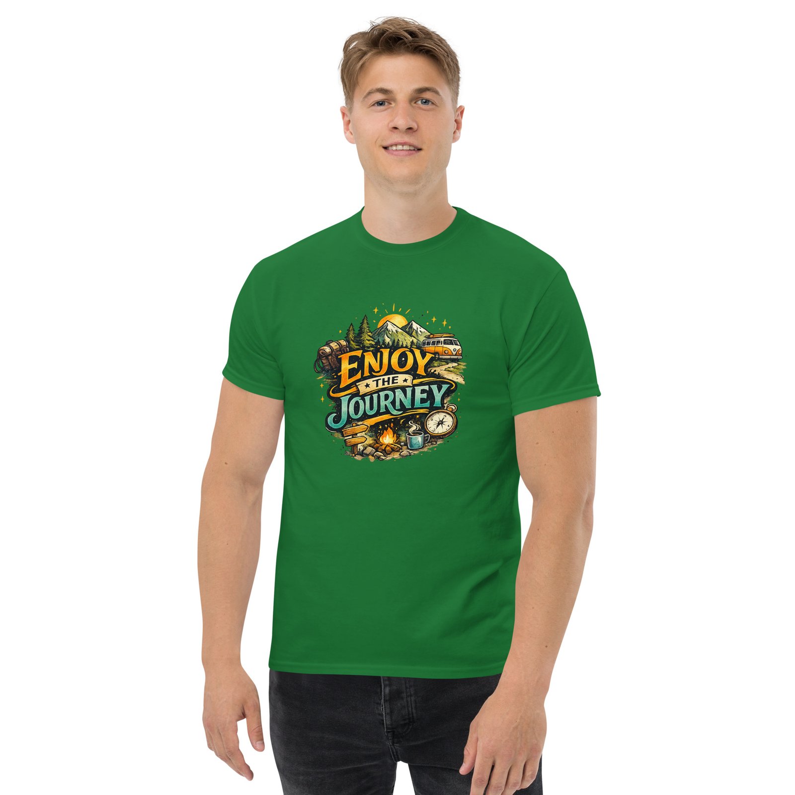The “Enjoy The Journey” Graphic T-Shirt is made for explorers, road trippers, and outdoor lovers. Featuring a beautifully detailed mountain landscape with camper van, campfire, and vintage elements, this design captures the spirit of freedom, adventure, and unforgettable memories.